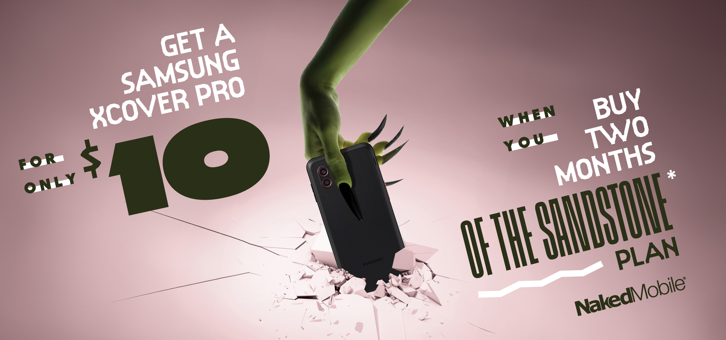 LIMITED TIME OFFER: Naked Mobile is a brand product of Smith Bagley, Inc. Between October 16, 2025 and January 5, 2026, new Naked Mobile customers who activate a line on the Sandstone Plan, prepay for two months and enroll in Autopay may receive a Samsung XCover Pro, certied pre-owned, smartphone (an $89.99 value) for $10.00. Sandstone Plan includes unlimited talk, text, and 10 GB of high-speed data at $35.00 per month plus tax. Sandstone Plan does not include hotspot data. Offer valid in-store only. Available for new lines of activation only. Does not apply to renewals. See your service agreement and terms and conditions for more details. Additional terms and conditions available at www.nakedmobile.com.